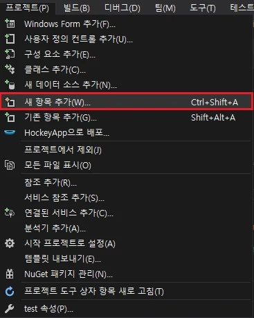 프로젝트(P) → 새 항목 추가(W)를 눌러 Splash Screen이 될 Form을 추가합니다.