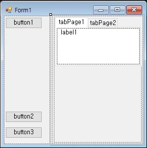 도구상자에서 SplitContainer, Button, TabControl, Label을 Form1에 생성합니다. 위의 이미지와 같이 배치합니다.