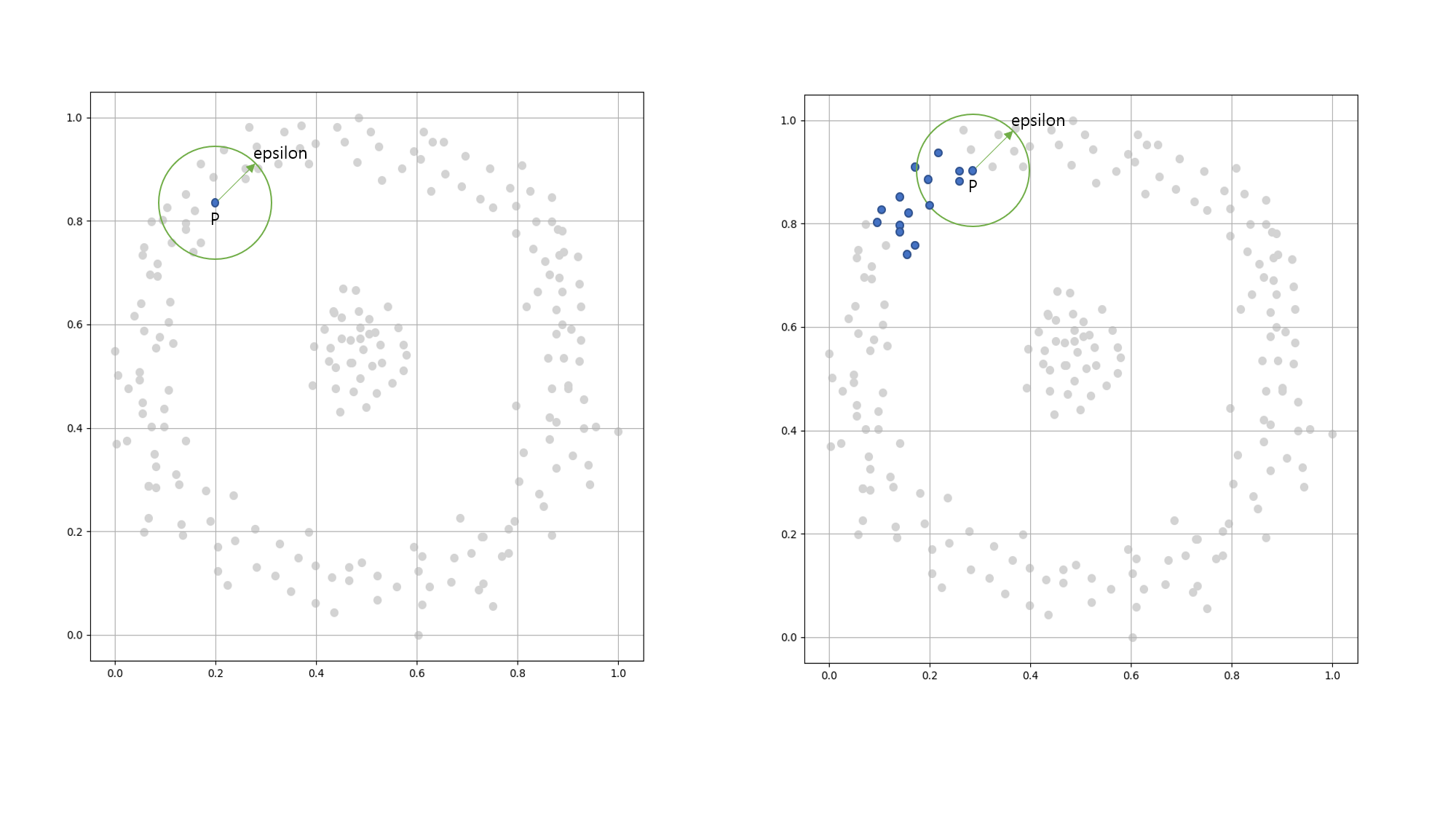 이 지역(특정 거리 안쪽)을 ε-이웃(epsilon-neighborhood)이라 부릅니다.