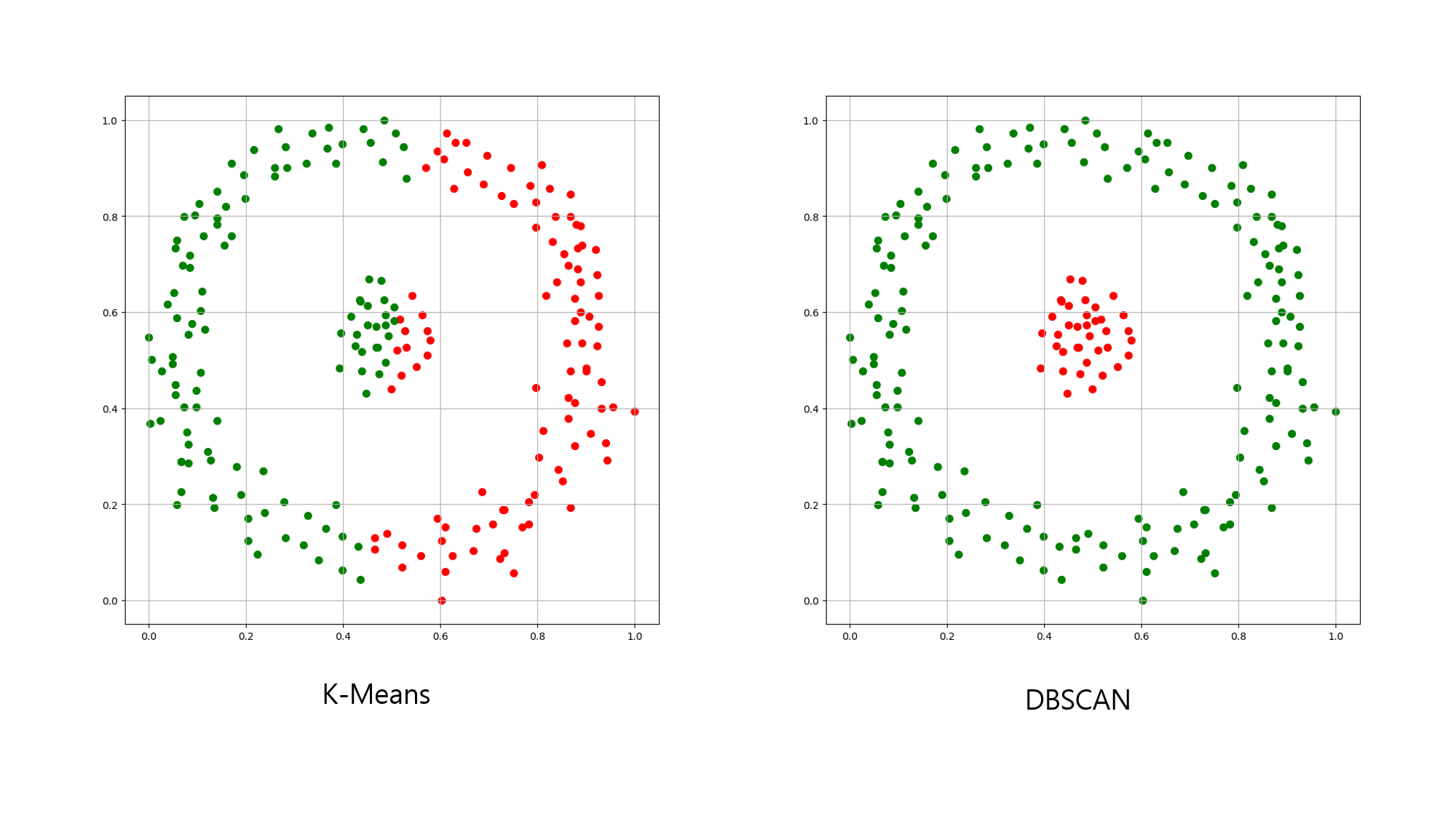 위 이미지는 같은 데이터를 K-평균 군집화와 밀도 기반 군집화로 군집화한 결과입니다.