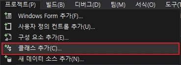 프로젝트(P) → 클래스 추가(C) 또는 프로젝트(P) → 새 항목 추가(W)를 눌러 클래스를 추가합니다.