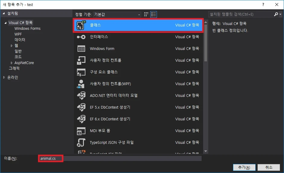 클래스를 선택하고 이름을 animal.cs로 변경하고 추가합니다.