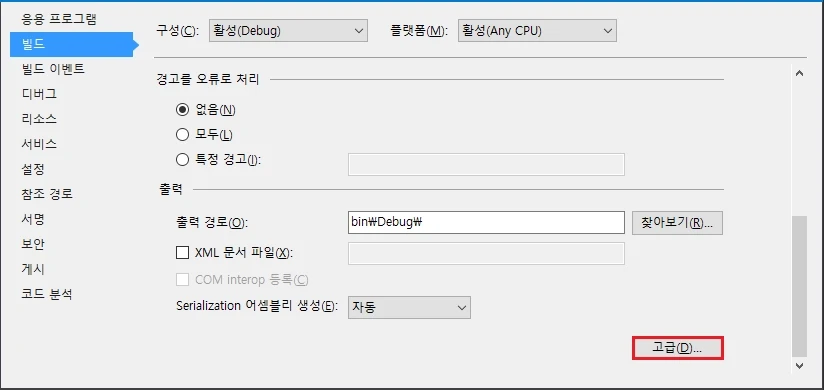 왼쪽의 탭 메뉴 중 빌드를 선택하고 가장 아래의 고급버튼을 클릭합니다.