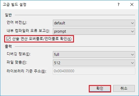 고급 빌드 설정에서 산술 연산 오버플로/언더플로 확인(K)에 체크한 후 확인 버튼을 클릭합니다.