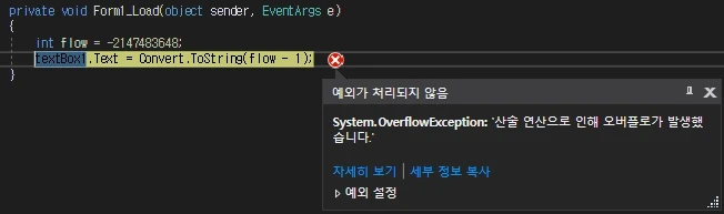 오버플로나 언더플로 발생 시 오류 메세지를 통하여 플로를 확인할 수 있습니다.