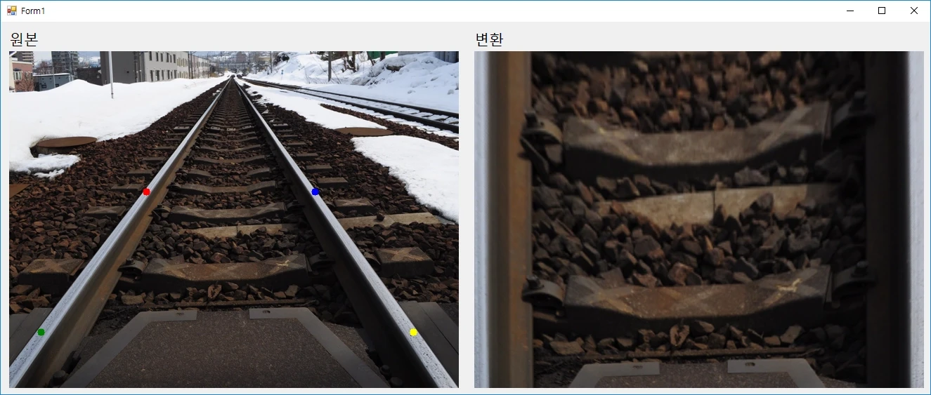 Cv.WarpPerspective(src, perspective, mapMatrix, Interpolation.Linear, CvScalar.ScalarAll(0));CvMat을 이용하여 mapMatrix를 선언해 변환된 이미지의 값을 계산합니다.