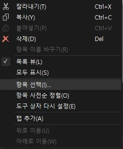 도구 상자의 빈 여백에 우 클릭하여 항목 선택을 클릭합니다.