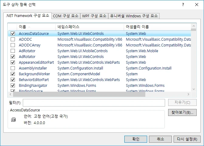 구성 요소에서 PictureBoxIpl을 찾아 정상적으로 체크되었는지 확인한 후, 확인 버튼을 클릭합니다.