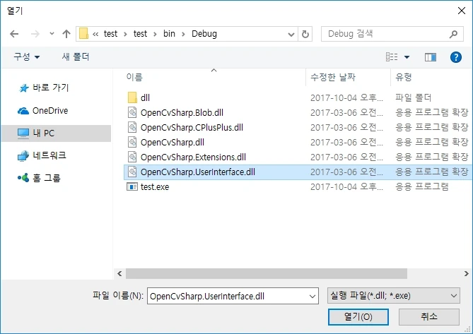 프로젝트의 경로를 따라간 후, bin → Debug 에서 OpenCvSharp.Userinterface.dll을 선택합니다.