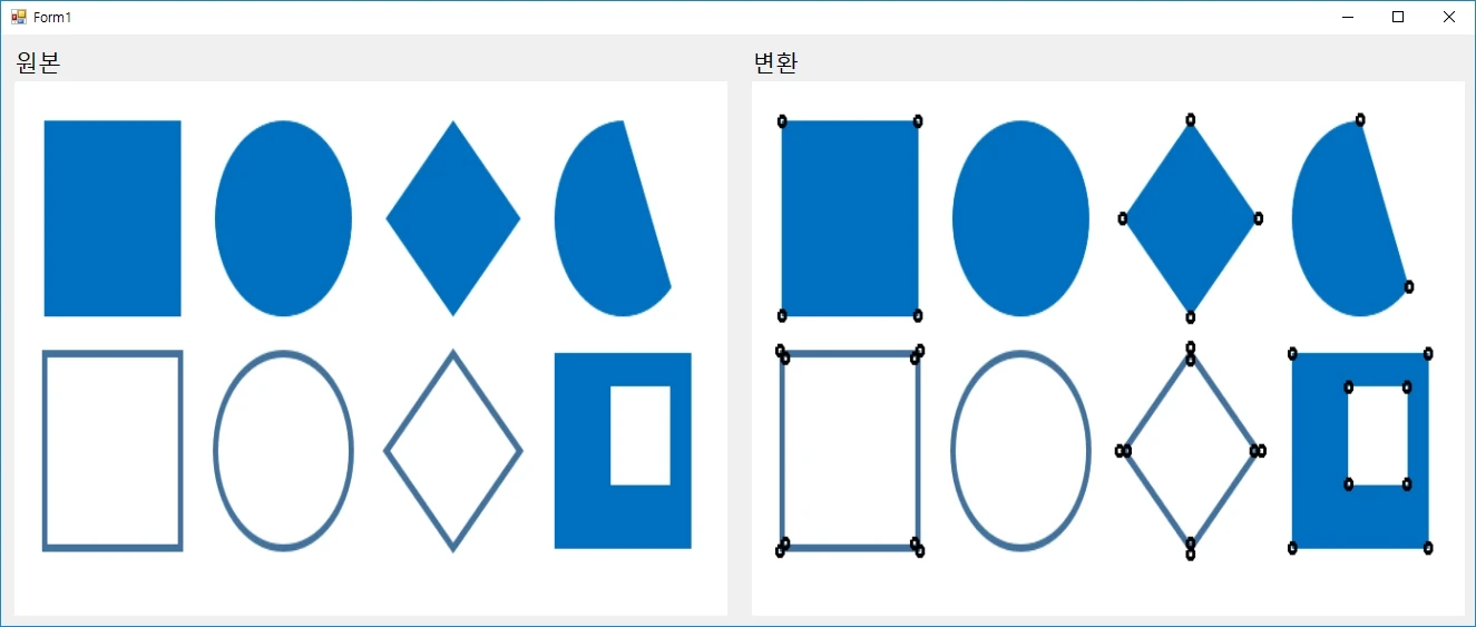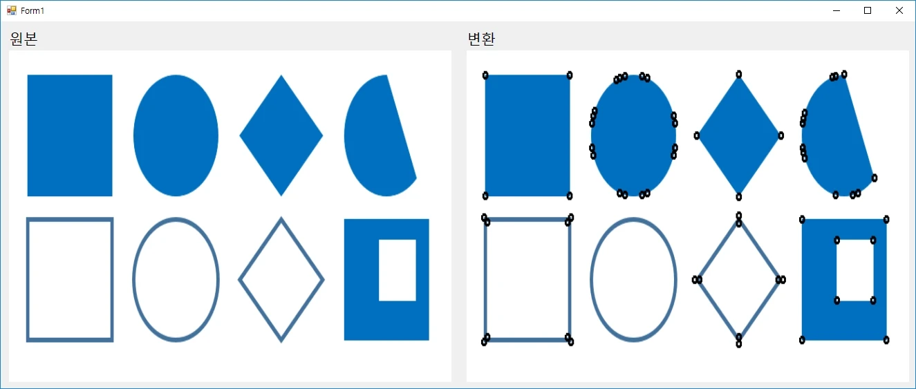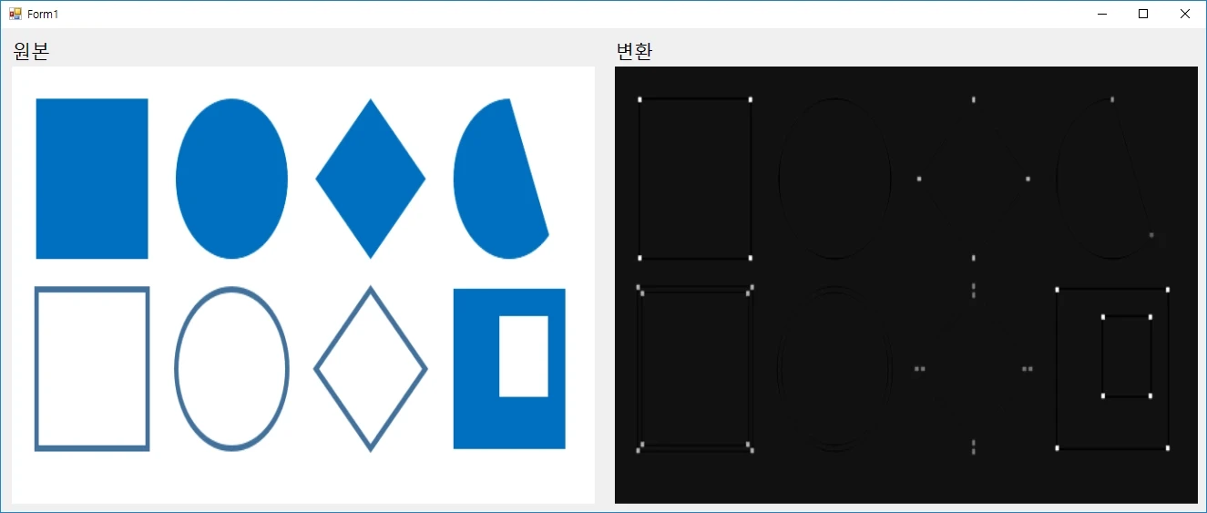 Cv.CornerHarris(gray, corner, 3, ApertureSize.Size3, 0.05);Cv.CornerHarris()를 이용하여 Harris 방법을 적용합니다.