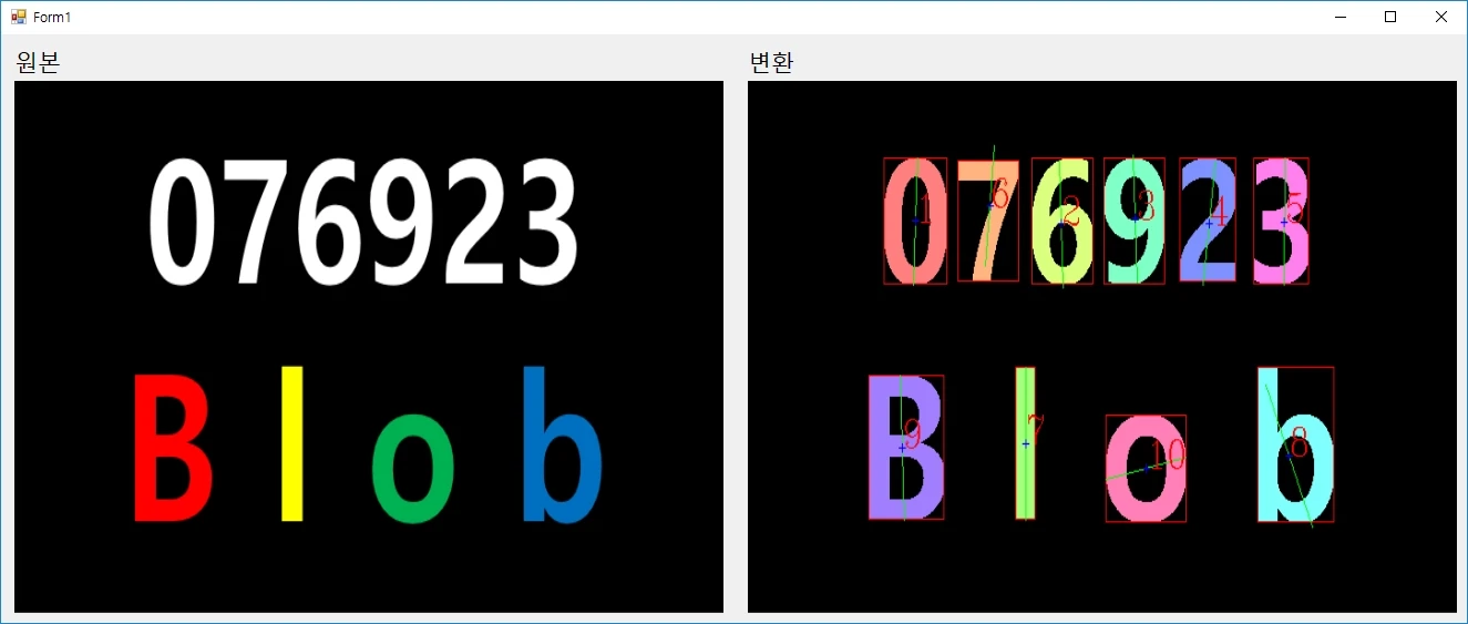 blobs.RenderBlobs(src, blob);blobs.RenderBlobs(원본, 결과);를 통하여 라벨링 결과를 확인할 수 있습니다.