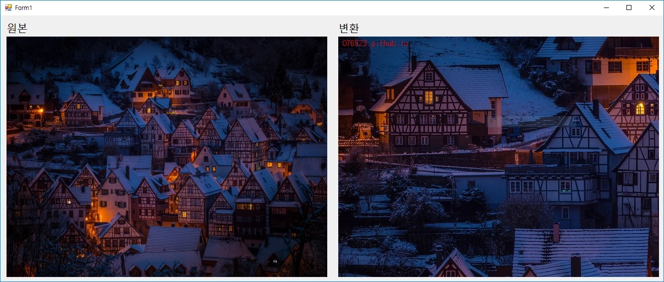 grp.DrawString("076923.github.io", new Font("굴림체", 12), Brushes.Red, 5, 5);좌측 모서리에 DrawString을 적용합니다.