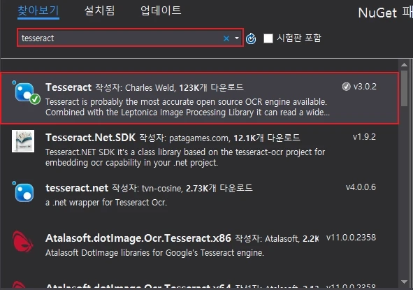 프로젝트 → NuGet 패키지 관리(N)...을 통하여 Tesseract를 설치할 수 있습니다.