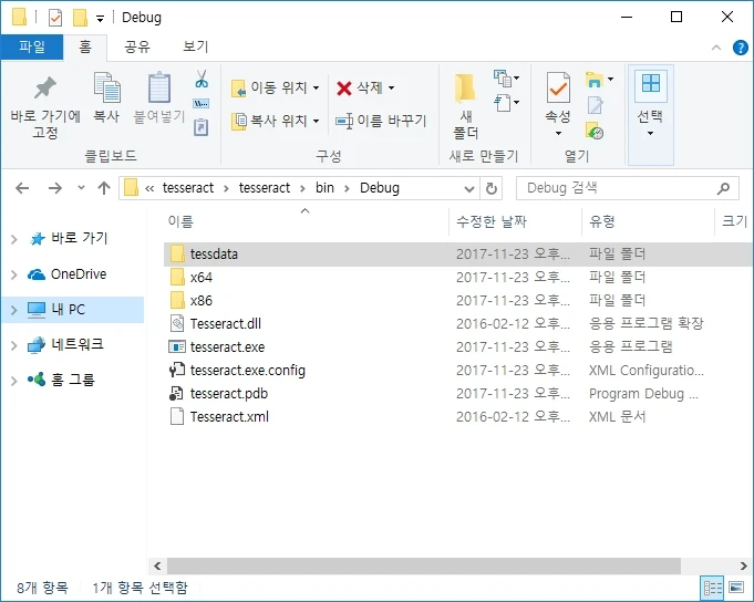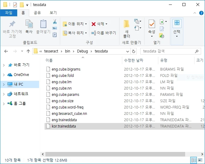 tessdata 폴더에 위와 같은 kor.traineddata 파일이 정상적으로 저장되어있는지 확인합니다.