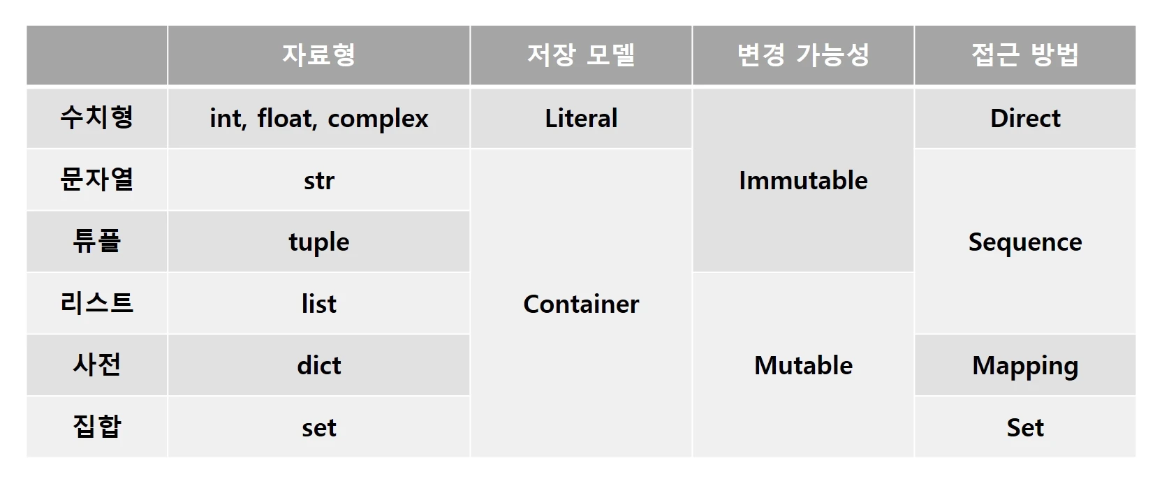 수치형, 문자열, 튜플, 리스트, 사전, 집합으로 분류할 수 있습니다.