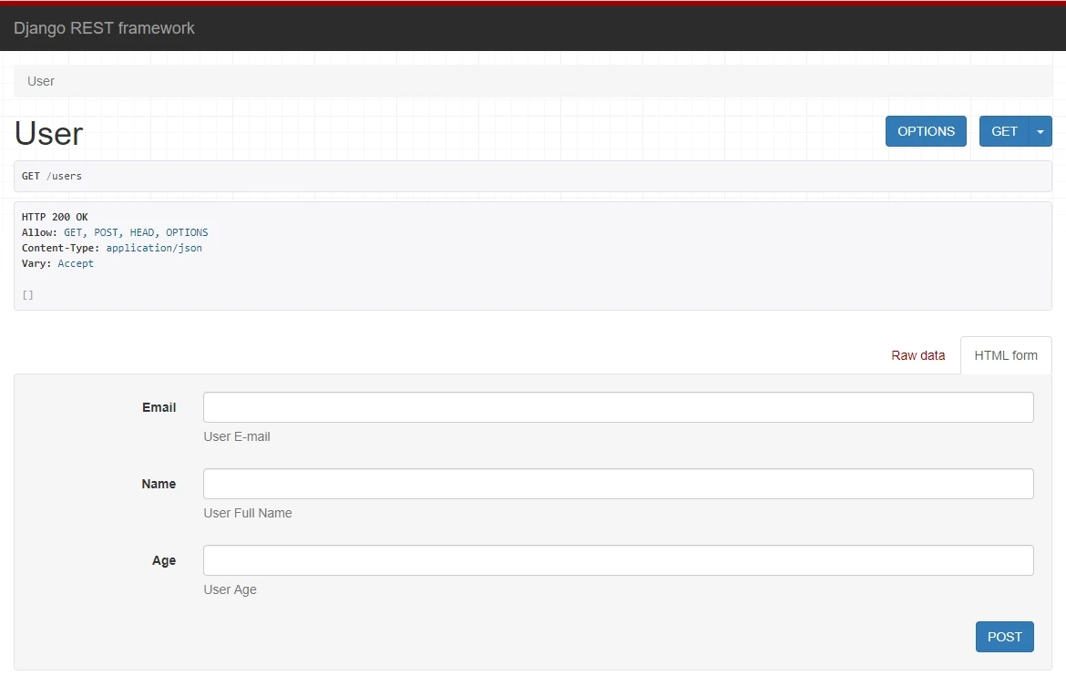 로컬 서버(http://127.0.0.1:8000/users)에 접속하면 위와 같은 화면을 확인할 수 있습니다.