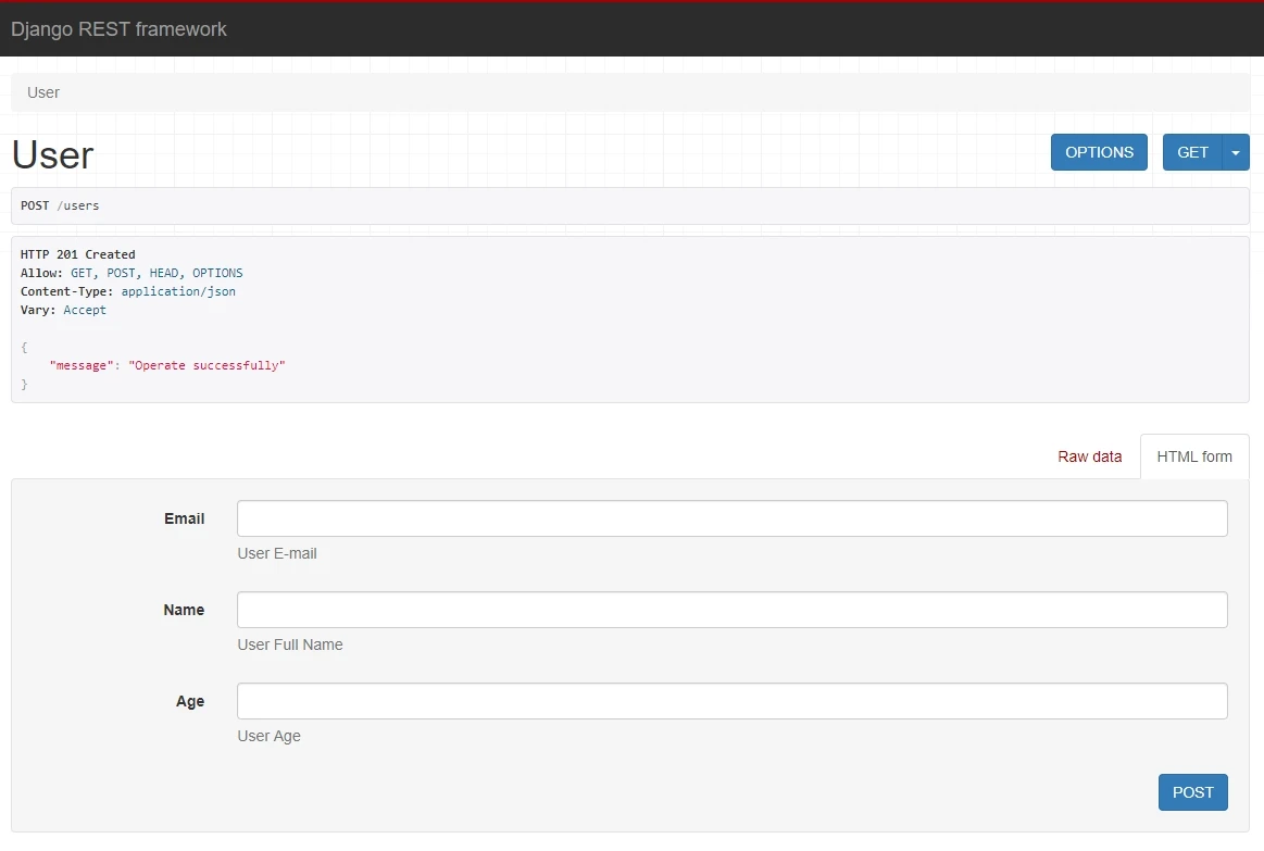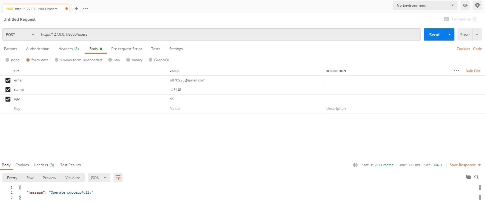 정상적인 값을 입력했다면, View에서 작성한 {"message": "Operate successfully"} 구문이 반환됩니다.