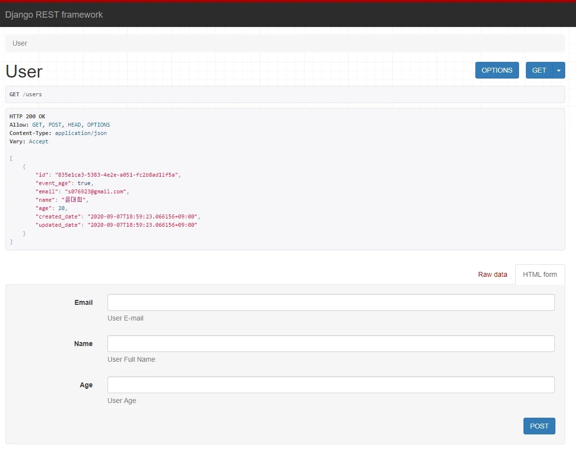 각각의 필드에 이메일, 이름, 나이를 작성한 다음, [POST] 버튼을 클릭합니다.