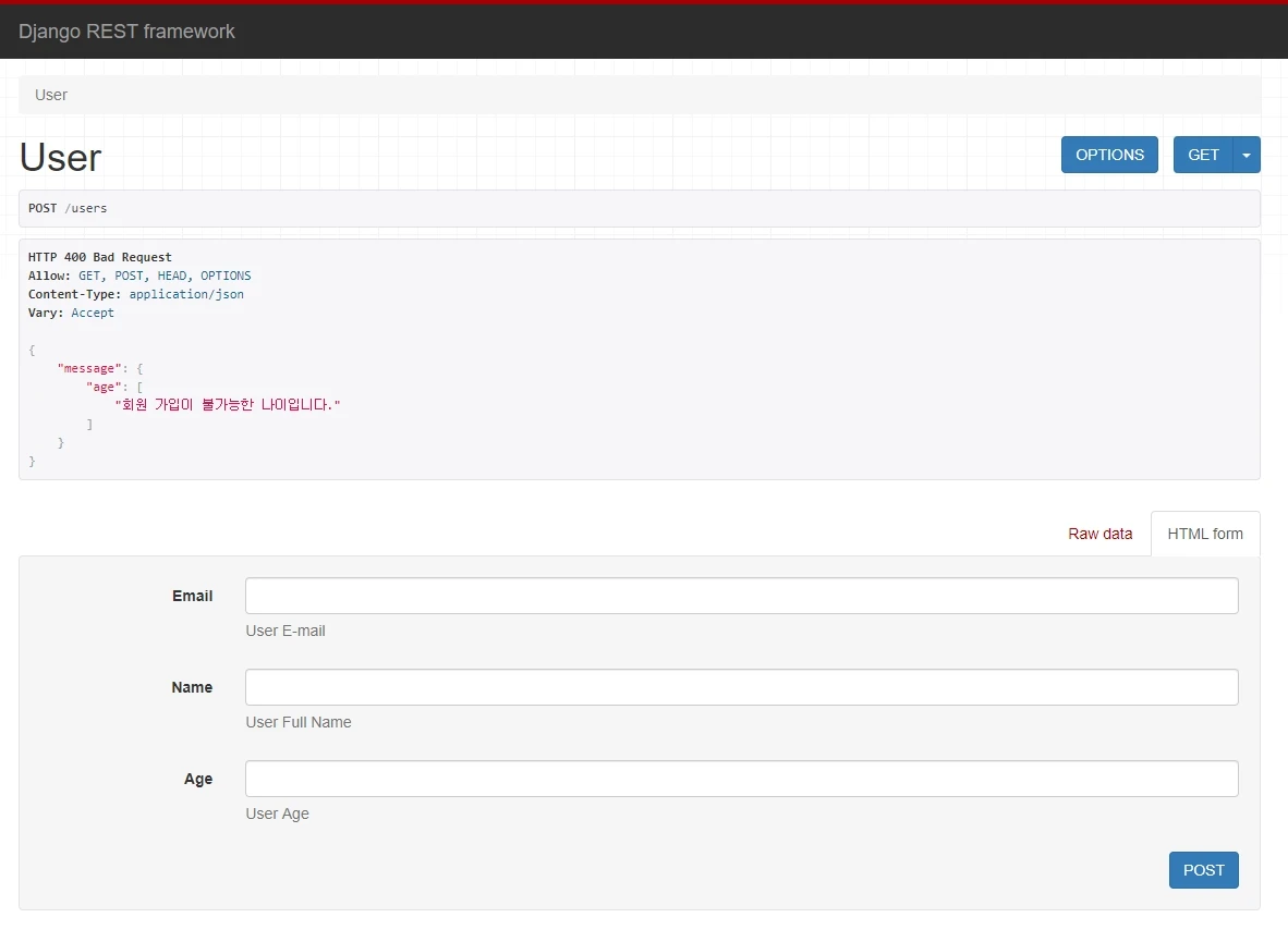 이번에도 이메일, 이름 그리고 나이의 값을 20미만으로 작성한 다음, [POST] 버튼을 클릭합니다.