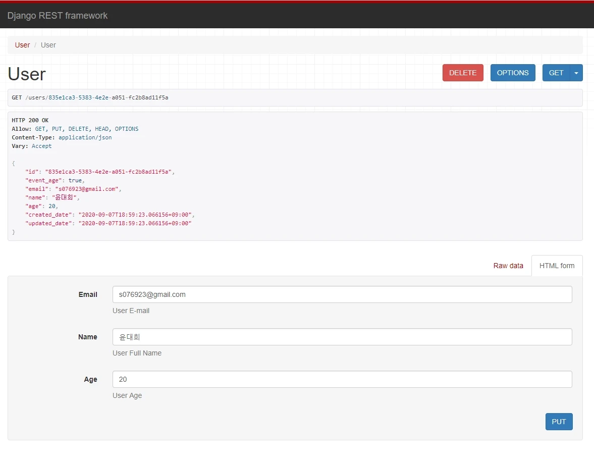 값을 수정한 다음 우측 하단의 [PUT] 버튼으로 값을 수정할 수 있으며, 우측 상단의 [DELETE] 버튼으로 입력된 데이터를 삭제할 수 있습니다.