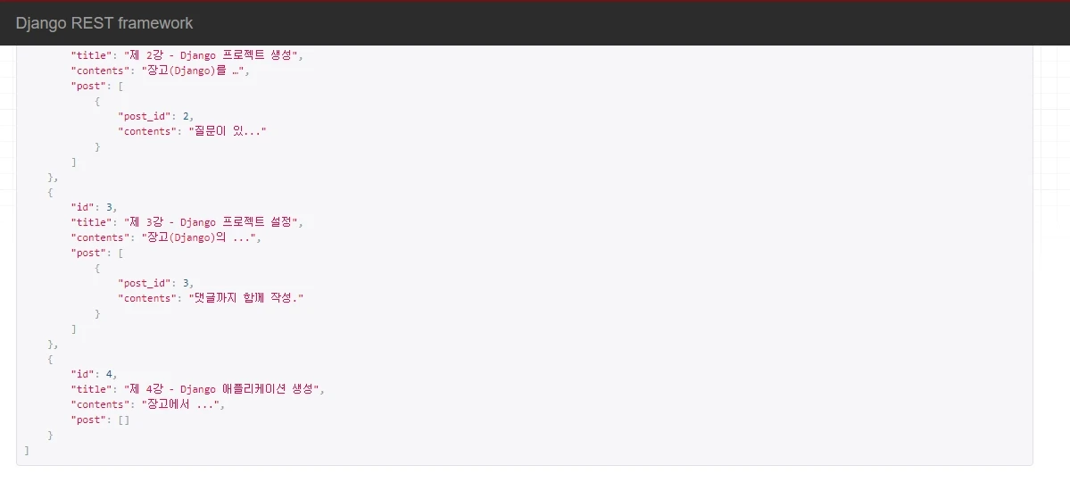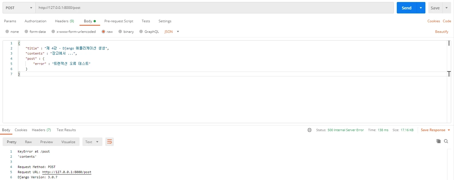 즉, request.data["post"]["contents"]를 불러올 때 contents 필드가 없어서 발생하는 오류는 try-except를 통해 별도로 잡아주어야 합니다.