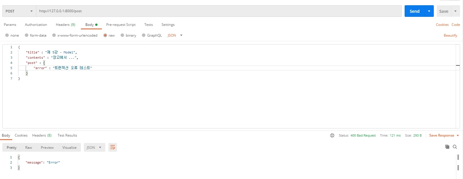 앞선 예제를 변경하지 않고, 위와 같이 post 필드 내부의 값이 문제가 있다면 오류를 반환하지만 데이터베이스에서는 Post 데이터와 관련된 데이터는 저장됩니다.