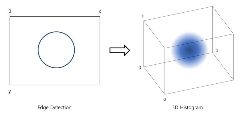 선정된 중심점(a, b)와 가장자리의 좌표를 원의 방정식에 대입해 반지름 r의 1차원 히스토그램으로 판단하게 됩니다.