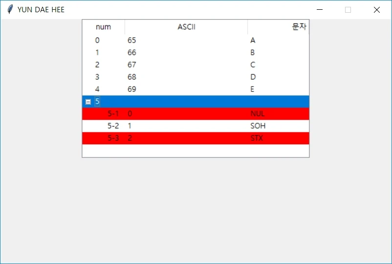 top_mid2=treeview.insert(top, 0, text="5-1", values=["NUL", 0], iid="5번-0", tags="tag2")
