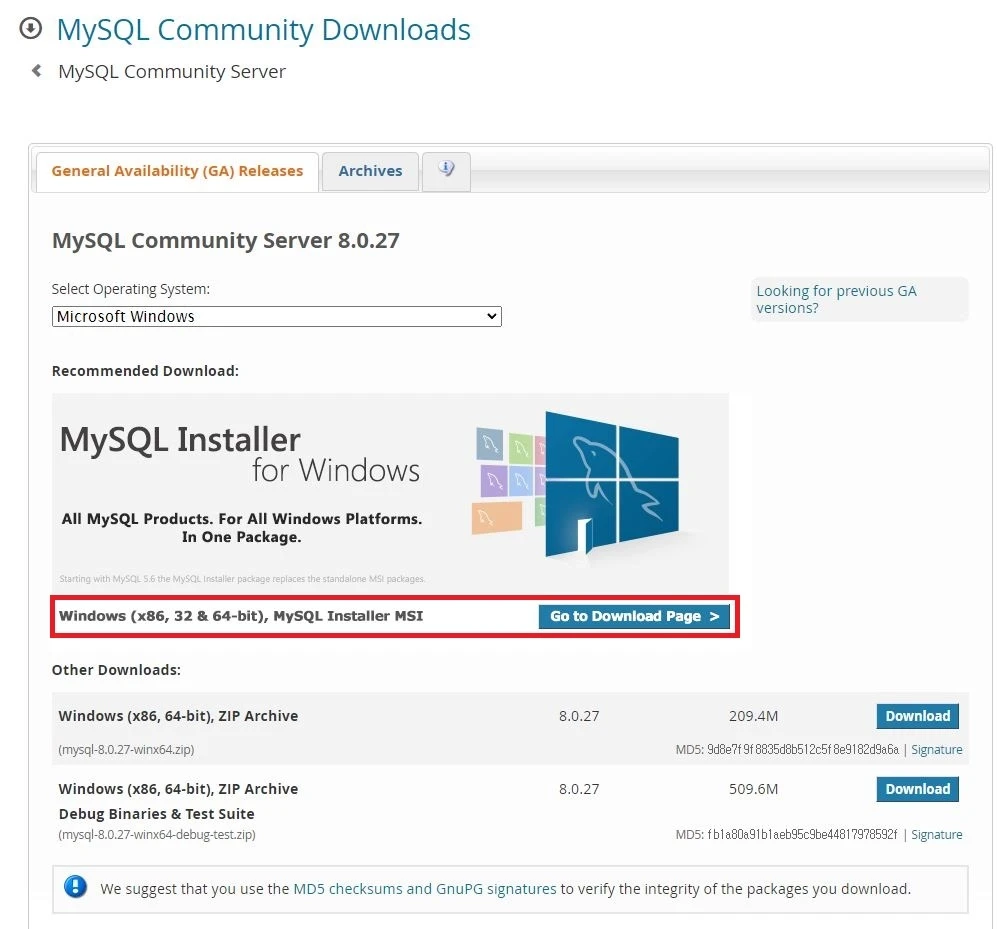 Windows (x86, 32 & 64-bit) MySQL Installer MSI를 클릭하여 설치 페이지로 이동합니다.