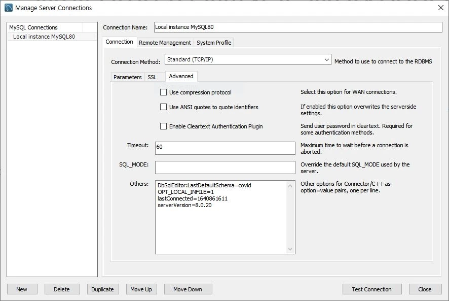 MySQL Workbench에서 CSV 파일을 추가하는 경우에는 MySQL Connections에서 설정을 변경해야 합니다.