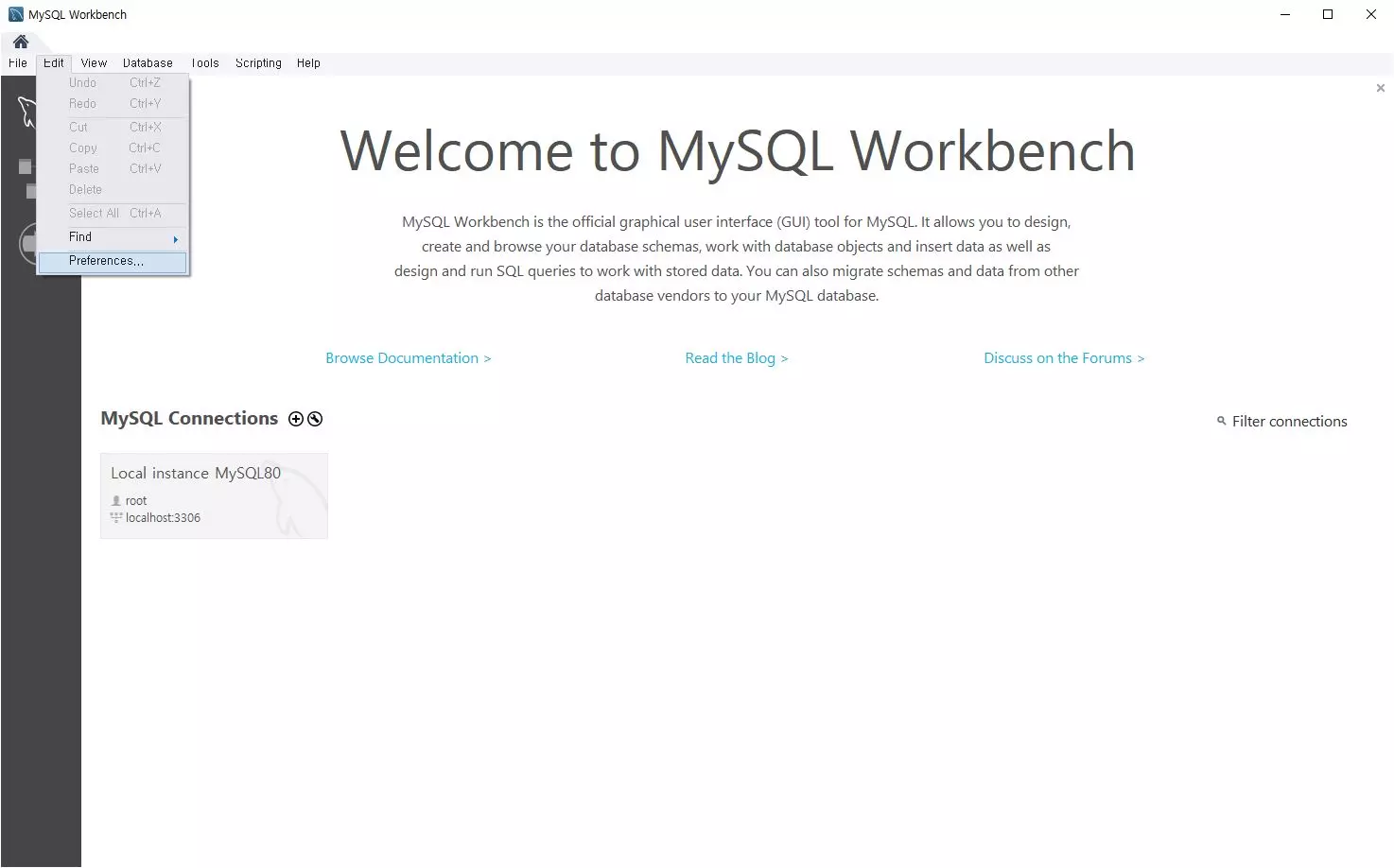 Workbench Preferences는 MySQL Workbench → Edit → Preferences...를 클릭합니다.