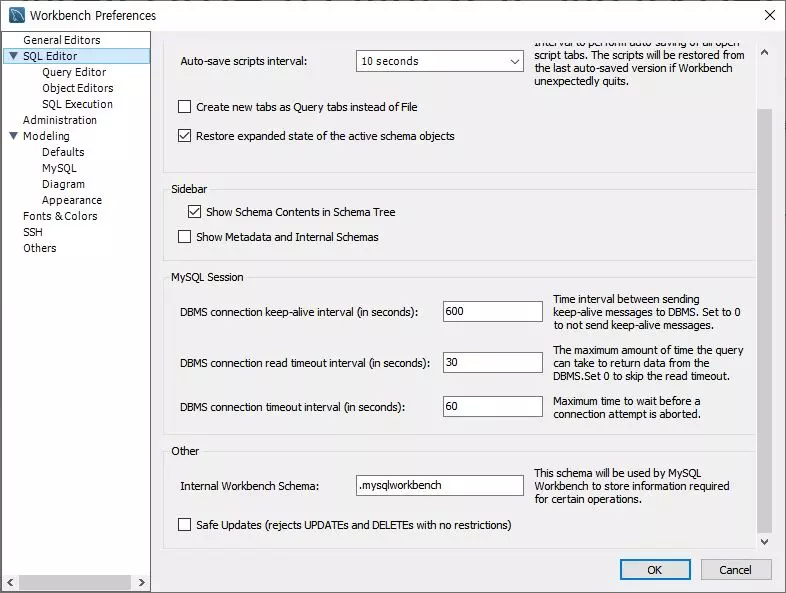 Workbench Preferences 메뉴창이 열렸다면, SQL Editor → Other에서 Safe Updates의 체크 박스를 해제하여 안전 모드를 비활성화 합니다.